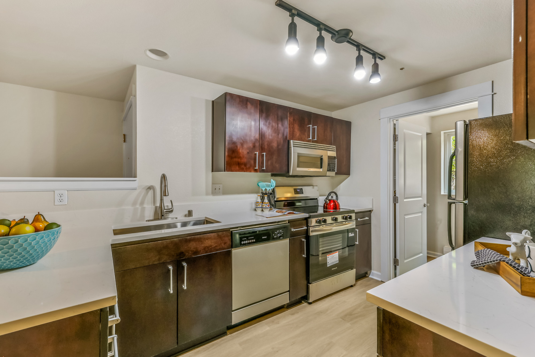 Quartz-capped breakfast bar introduces the updated kitchen, showcasing freshly painted white cabinetry, sleek stainless appliances, and durable LVP flooring. Deep under-mount sink with modern pull-down faucet, electric range with microwave hood, and full-size dishwasher.