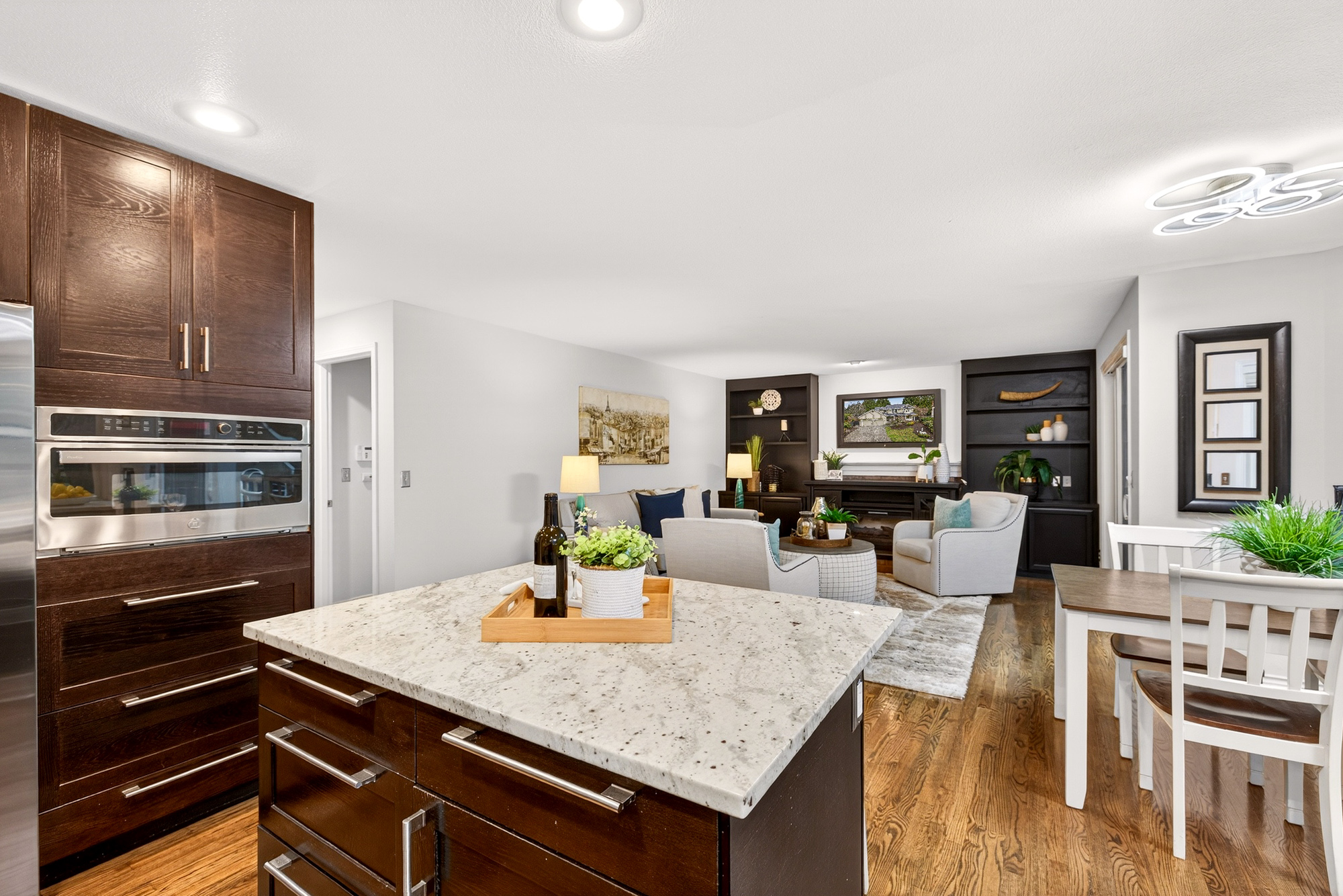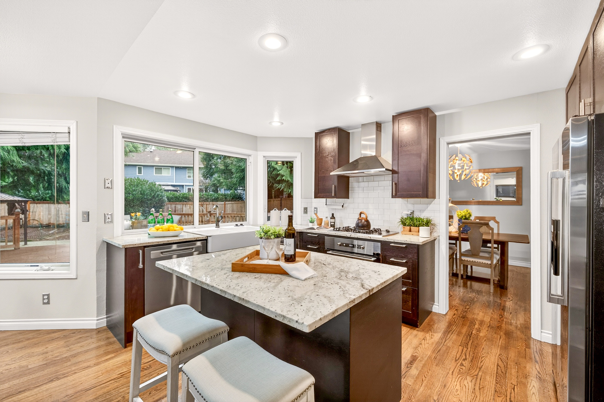 A charming front porch, mature landscaping, and a wisteria-draped trellis set the tone as you arrive. Step inside to a thoughtfully updated 2,090 sq ft layout with fresh design and modern conveniences. The foyer opens to light-filled living and dining spaces, enhanced by updated hardwood floors and expansive bay windows that bring the outdoors in. Just beyond, a beautifully remodeled kitchen anchors the main level with slab granite counters, a farmhouse-style sink, and newer stainless steel appliances-including gas cooktop. Rich cabinetry and a central island with seating create a kitchen that’s both elegant and efficient—perfect for gathering, cooking, or entertaining.