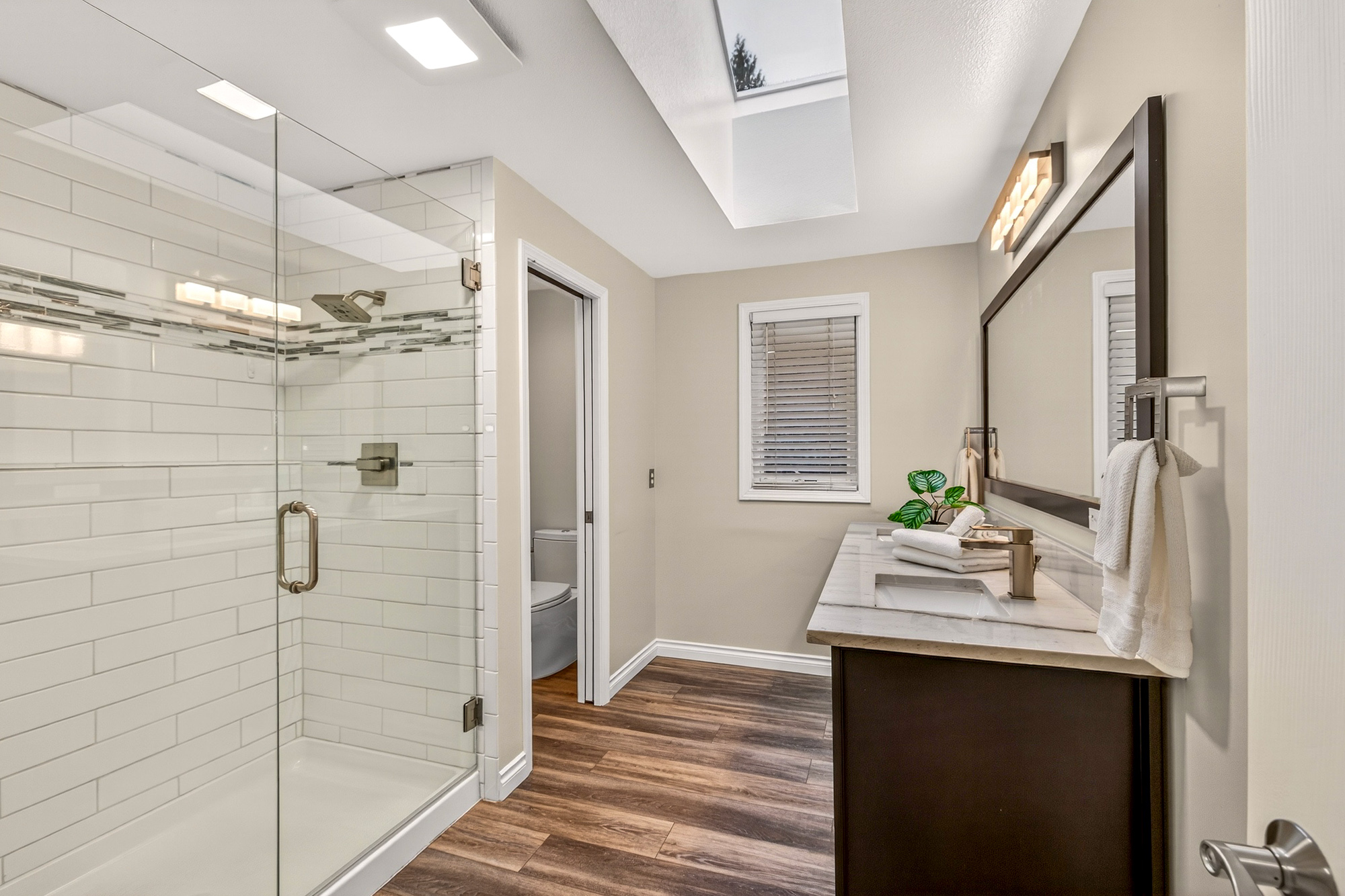 Upstairs, the spacious primary suite features vaulted ceilings, a bay window, and a fully remodeled bath with dual vanities, double shower heads, and a walk-in closet with custom built-ins. Three additional bedrooms provide versatility for family, guests, or work-from-home needs. Murphy bed included. A stylish and updated full bath with quartz-topped vanity completes the upper level.
