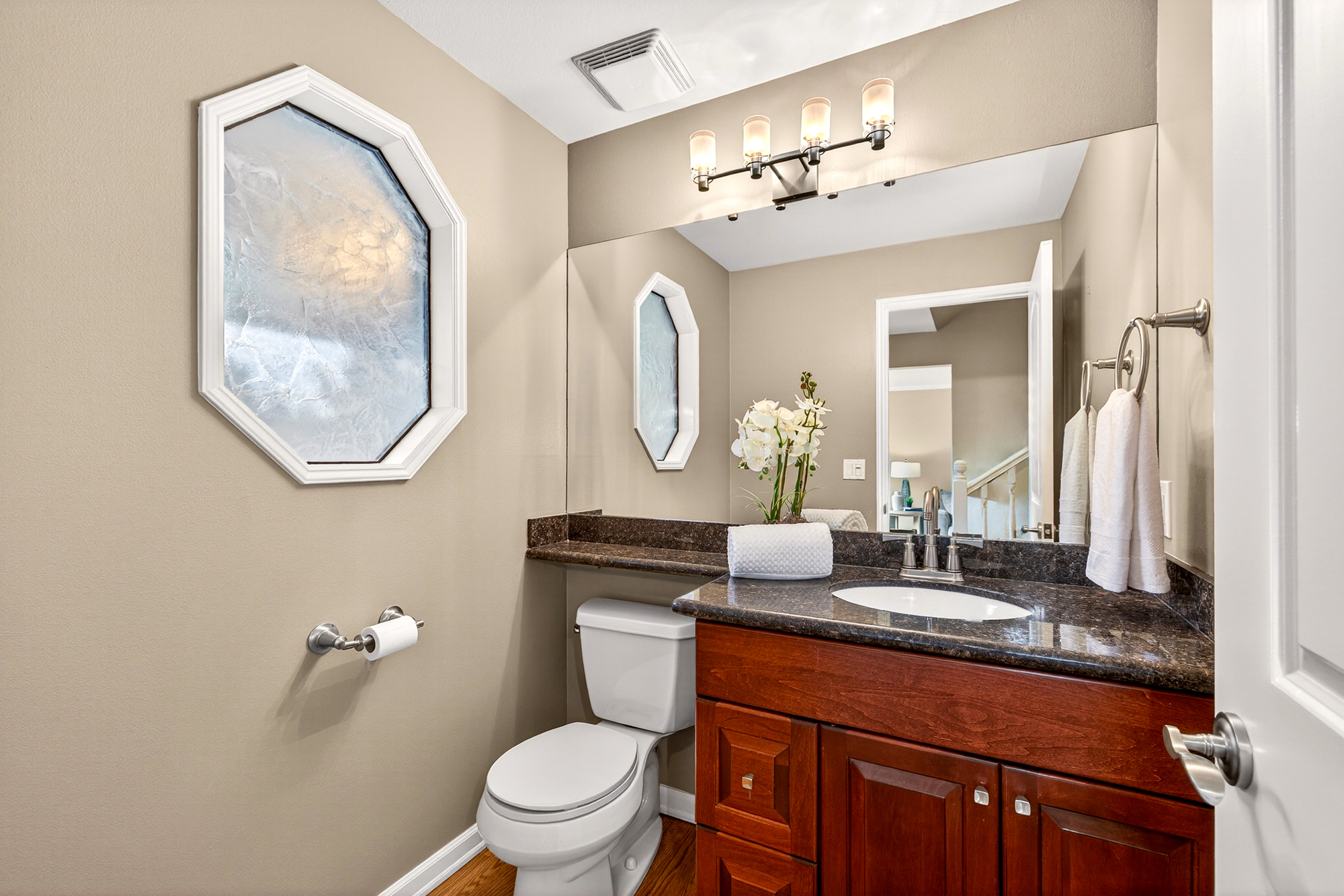 The kitchen is warm and timeless with rich wood cabinetry, granite counters, a tile backsplash, stainless appliances, and a breakfast bar for extra prep space. A sunny window over the sink brings the outdoors in, complemented by updated lighting and under sink water filtration. The adjacent nook is ideal for casual dining, morning coffee, or a planning space, and it flows into the family room where a classic brick fireplace and a French door to the deck create an easy indoor outdoor connection. An updated powder bath with a granite counter and a large mirror is perfect for guests, and a dedicated laundry room off the hall keeps daily routines convenient. The attached two car garage offers excellent storage for gear, tools, and seasonal items.