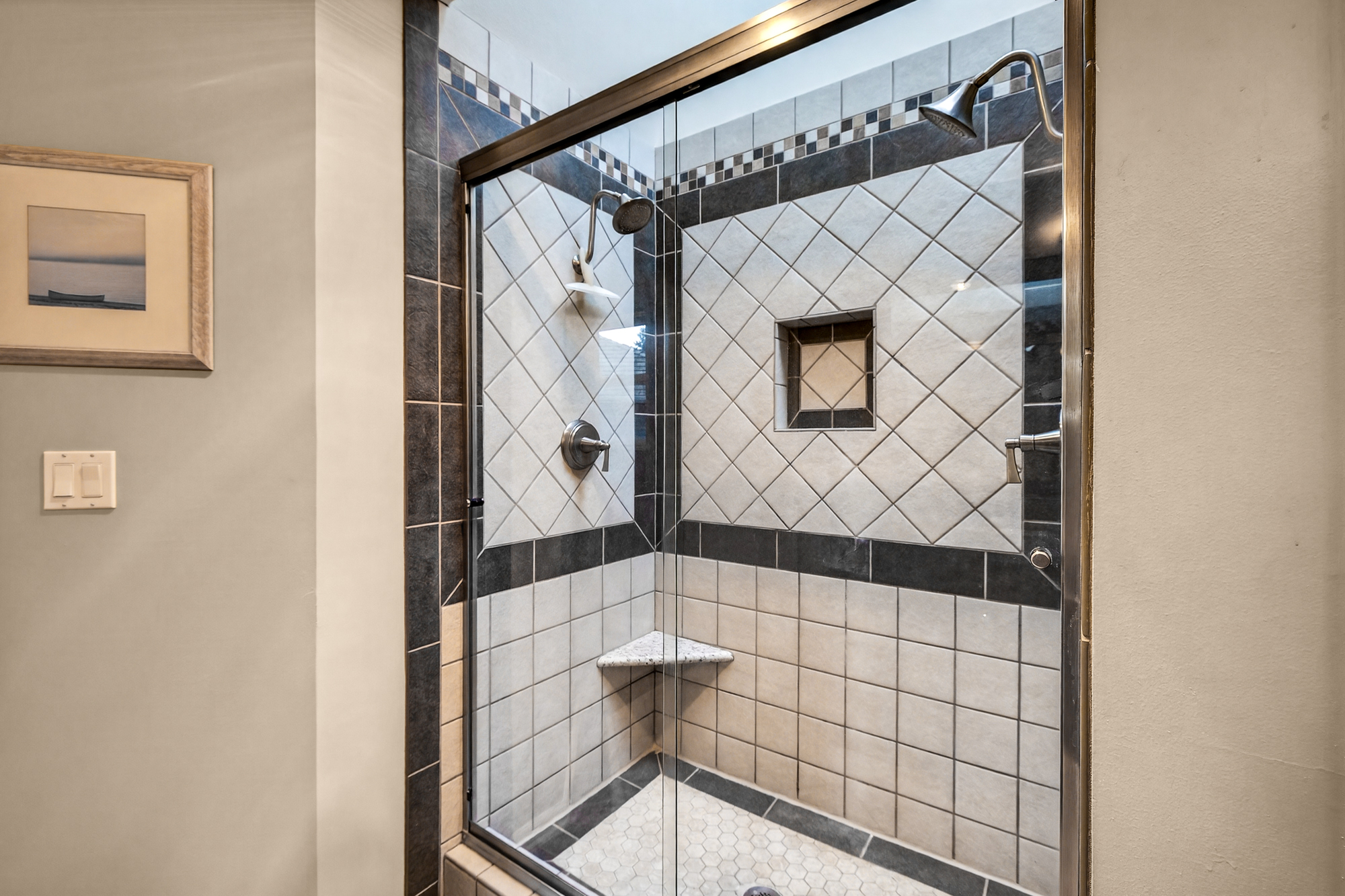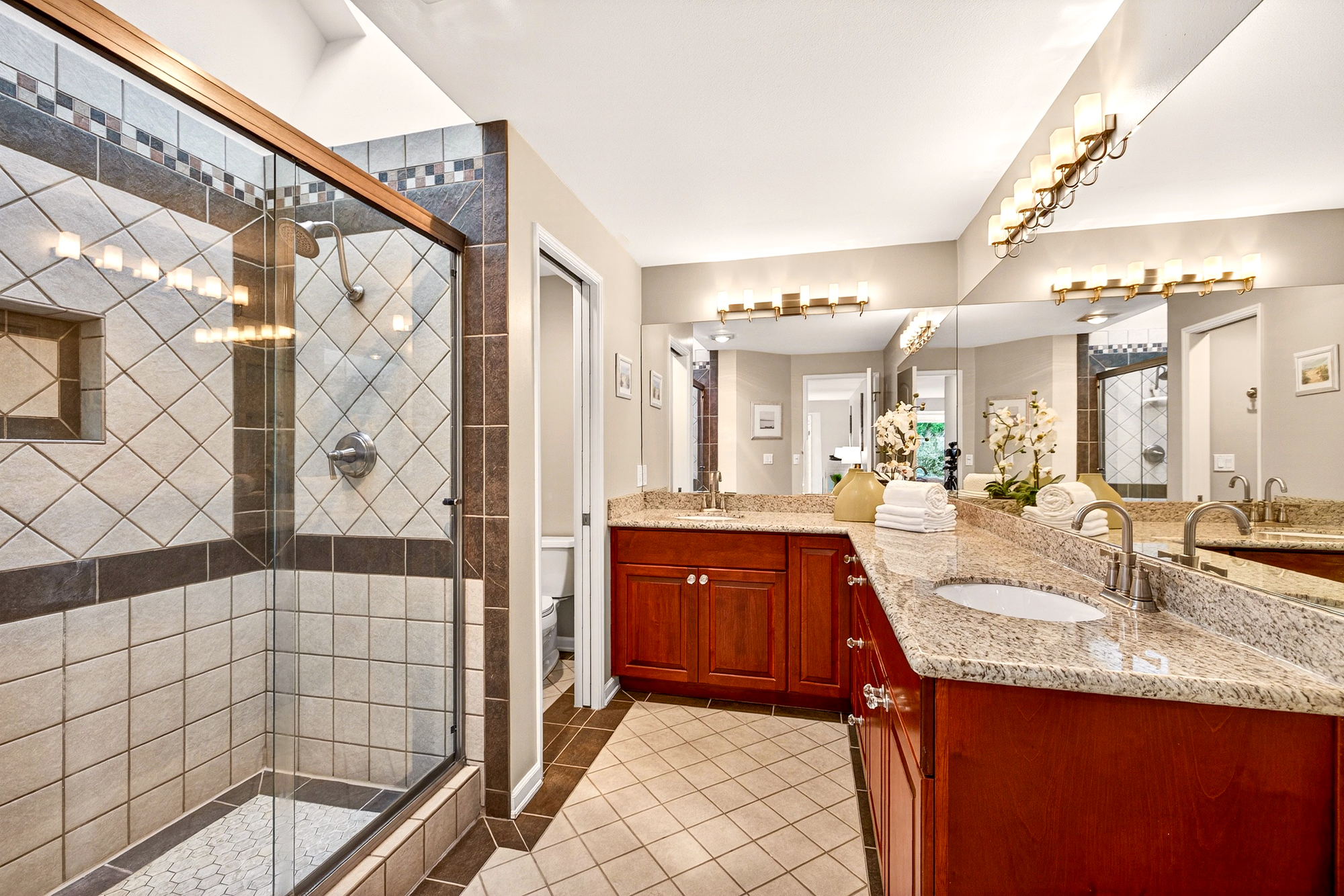 Upstairs, the primary suite is a restful retreat with generous proportions, a walk in closet, and a private bath featuring a dual sink vanity, great lighting, and a spacious tile shower with a skylight, corner shelf, and niche. Three additional bedrooms are bright and well sized, offering excellent flexibility for guests, work from home needs, or hobbies, along with a refreshed hall bath.